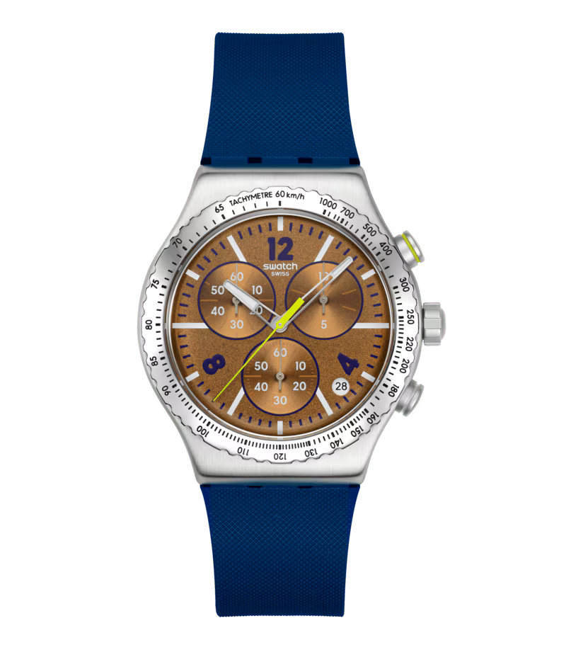 This chronograph features a brown dial with dark blue printed numerals and minute markers, white printed hour markers, brown subdials with sun-brushed finishing and brown and white print, and a date window between 4 and 5 o'clock. Silver-colored hour and minute hands that glow in the dark and a yellow chronograph seconds hand point to the time. The brushed stainless steel case is complemented by a polished stainless steel bezel with a black engraved tachymeter scale, a textured matte dark blue strap with matte dark blue loops, and a brushed stainless steel half-buckle.