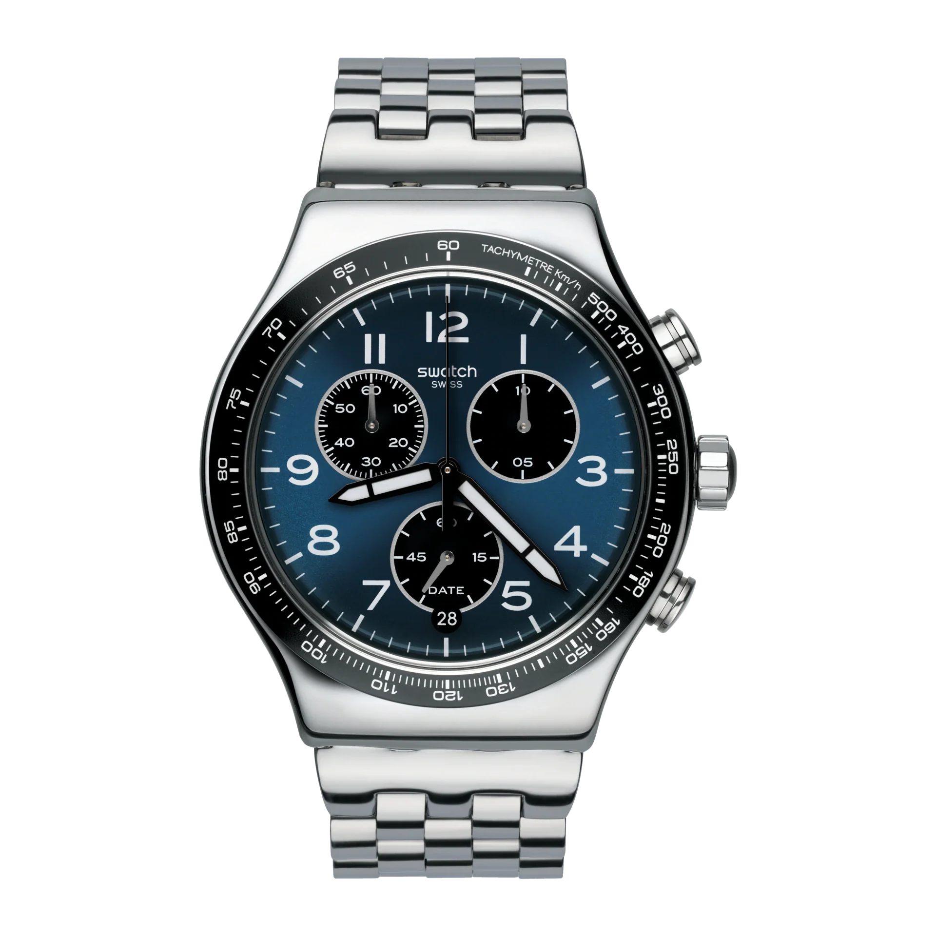 A timeless design for the man on the go, the BOXENGASSE (YVS423GC) watch features a sun-brushed blue dial with white Arabic numerals, silver and white prints, three counters and a date window at 6 o'clock. This sophisticated style is set apart with a polished stainless steel case and a black bezel. A polished stainless steel strap with a traditional link pattern completes the design.